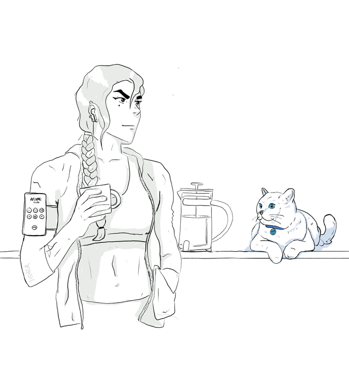 I threw on the clothes Korra had picked out for me—a well-worn old concert shirt and comfortable shorts that I had to roll twice on my hips to secure in place—and freshened up in her washroom before making my way to the kitchen.
