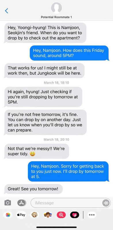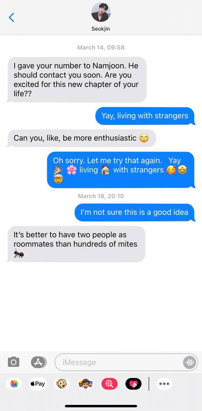 Before his mind can further conjure horrendous scenarios of being eaten by termites, his text notification sets off. When he looks down at his screen, he’s greeted with one message from Seokjin, and another from Potential Roommate 1. Another message comes in when he unlocks his phone, also from Potential Roommate 1.