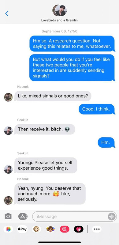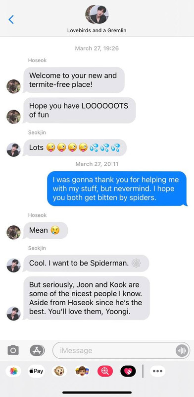 He kind of wants to reply to Seokjin just to tell him that that is not an emoji of a termite, just to spite the older man. But he decides against it when another message from Potential Roommate 1 comes in. He lets out a deep breath and begins typing a reply.