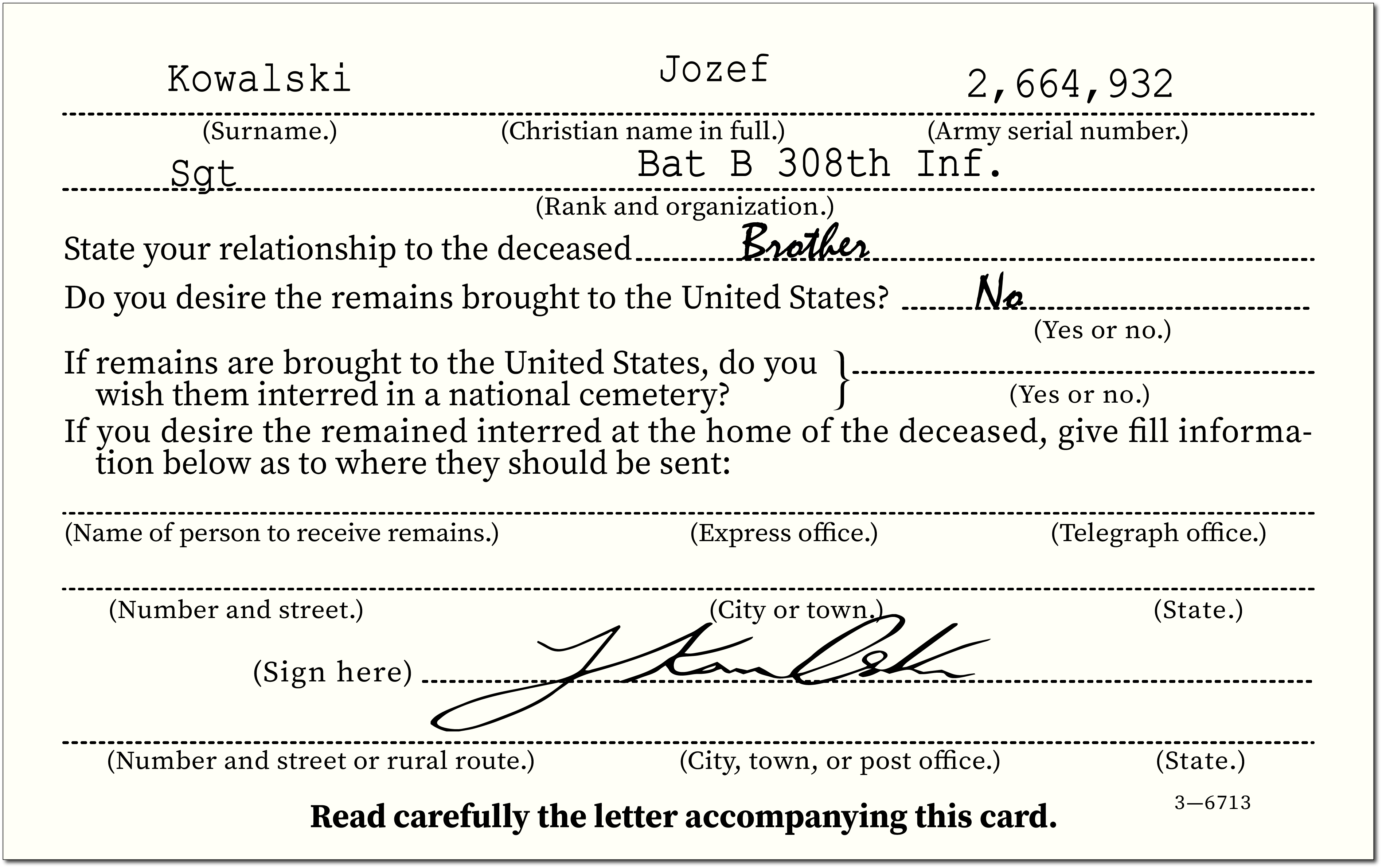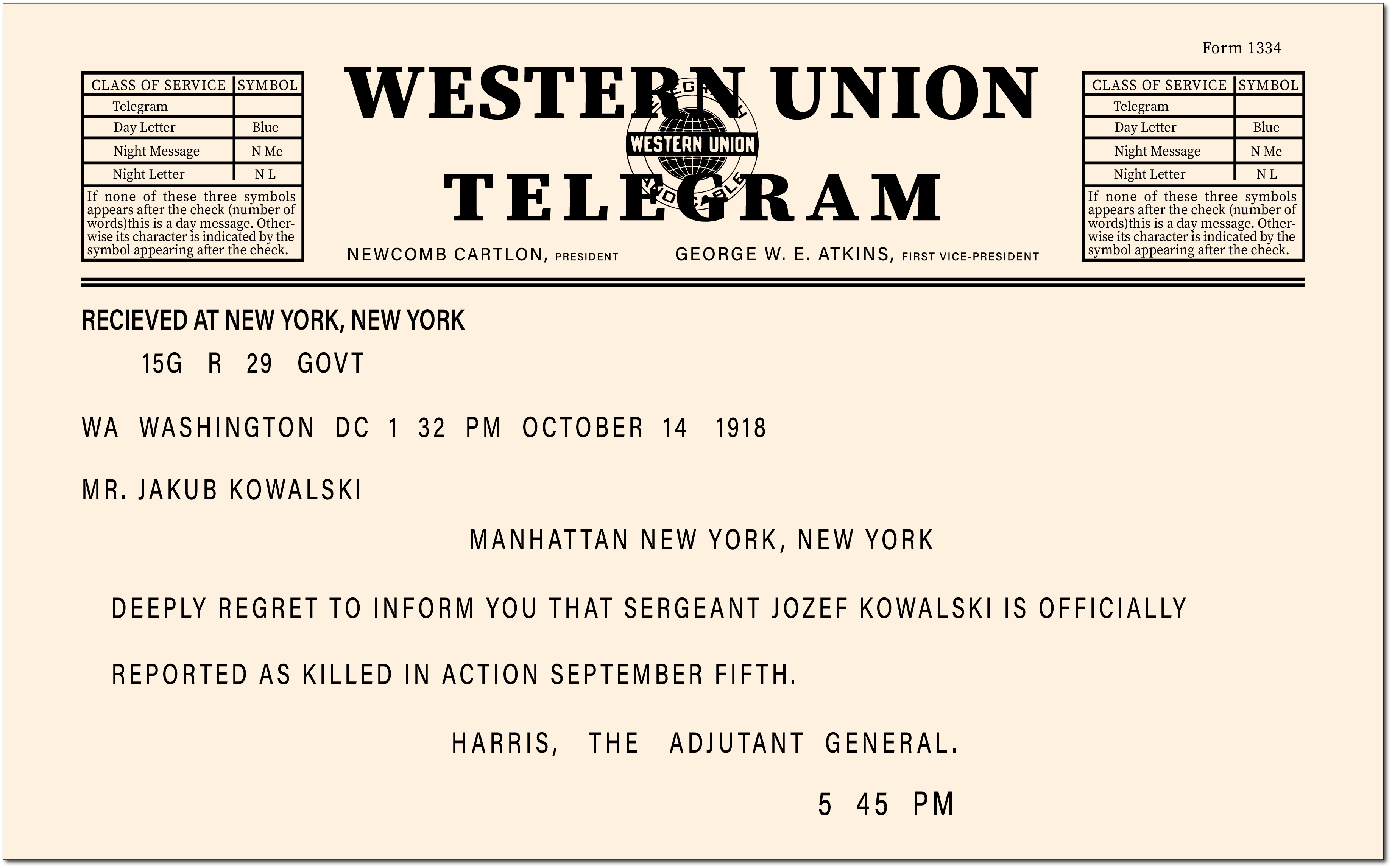 Józef dies in the Oise-Aisne campaign and is buried in the cemetery commemorating that battle, alongside over 6,000 American service-members in real life. Yes, telegrams were the norm for casualty notifications during this era - that won't change for another 40-odd years. And yes, it often did take them Several Weeks to identify the body and notify next of kin during World War I.