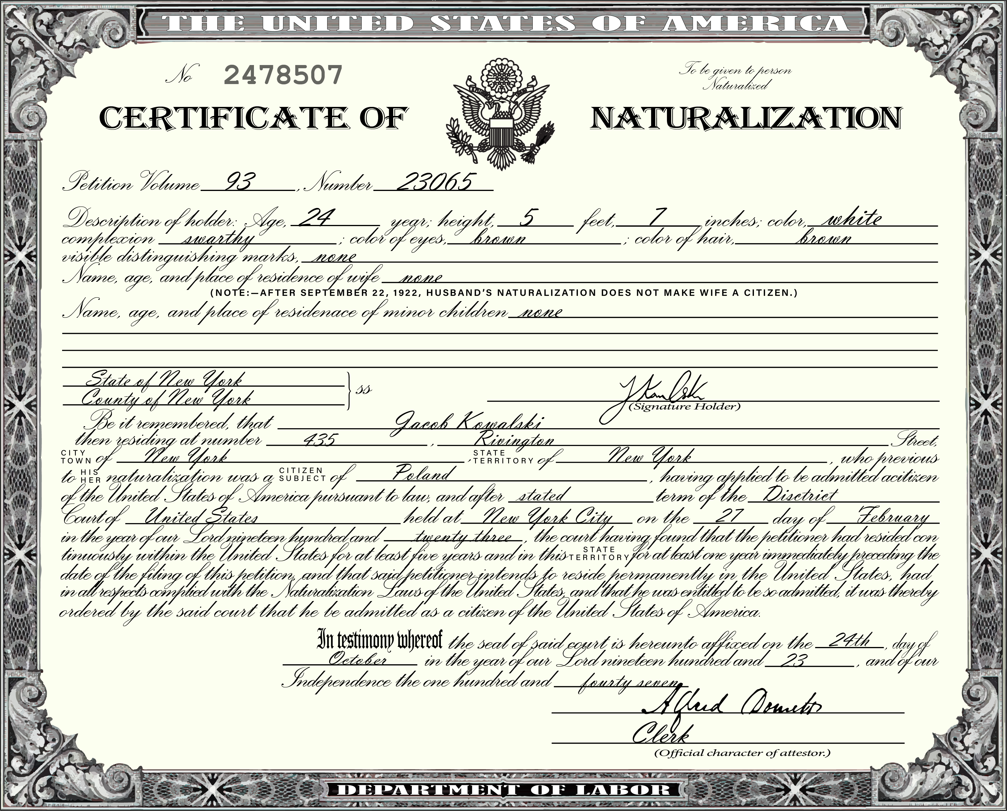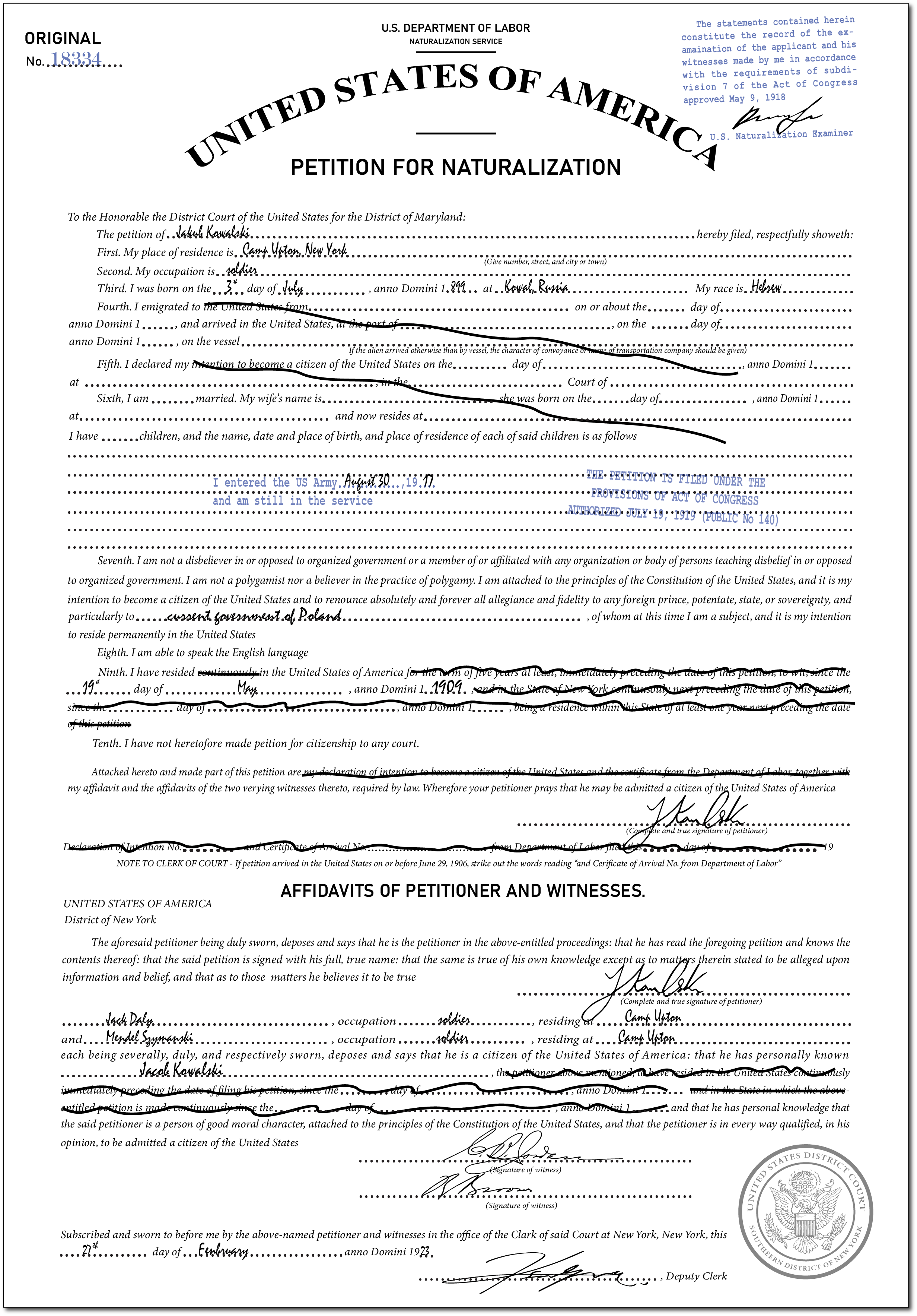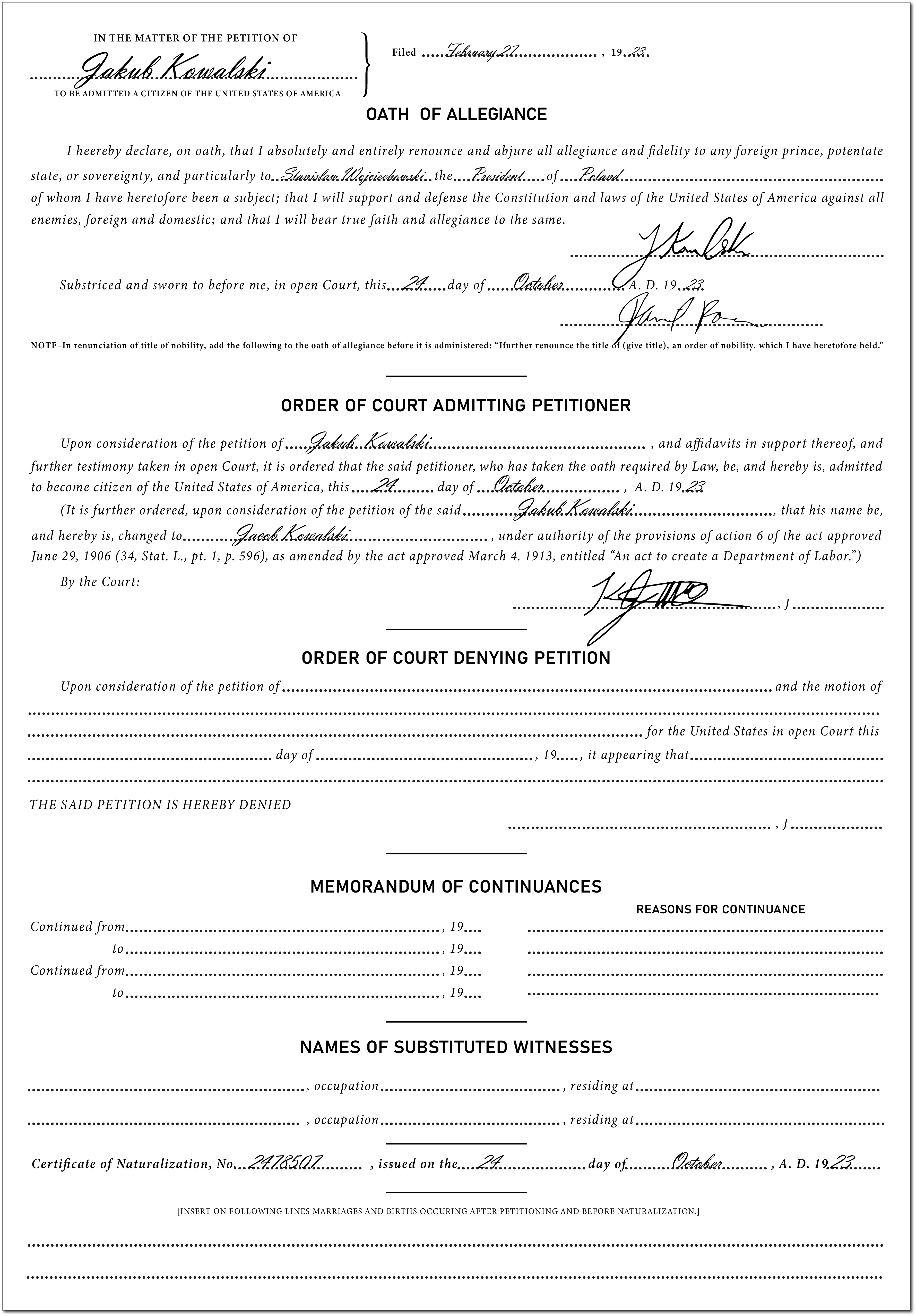 “I hereby declare, on oath, that I absolutely and entirely renounce and abjure all allegiance and fidelity to any foreign prince, potentate, State, or sovereignty, and particularly to Poland of which I have heretofore been a subject; that I will support and defend the Constitution and laws of the United States of America against all enemies, foreign and domestic; that I will bear true faith and allegiance to the same; and that I take this obligation freely without any mental reservation or purpose of evasion. So help me God.”