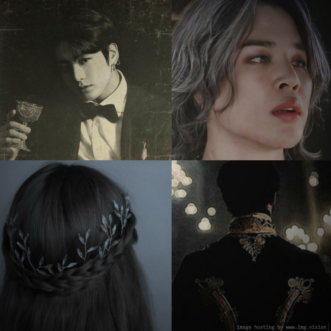 Jimin strolls through the garden, going across the small bridge over the pond. The moon is high in the sky and his silver hair shines under the light, moonlight reflecting on his smooth cheeks. His turquoise silk robe graces the flowers and grass as he moves to the clearing right under the moonlight where Jungkook is waiting, his back to Jimin.