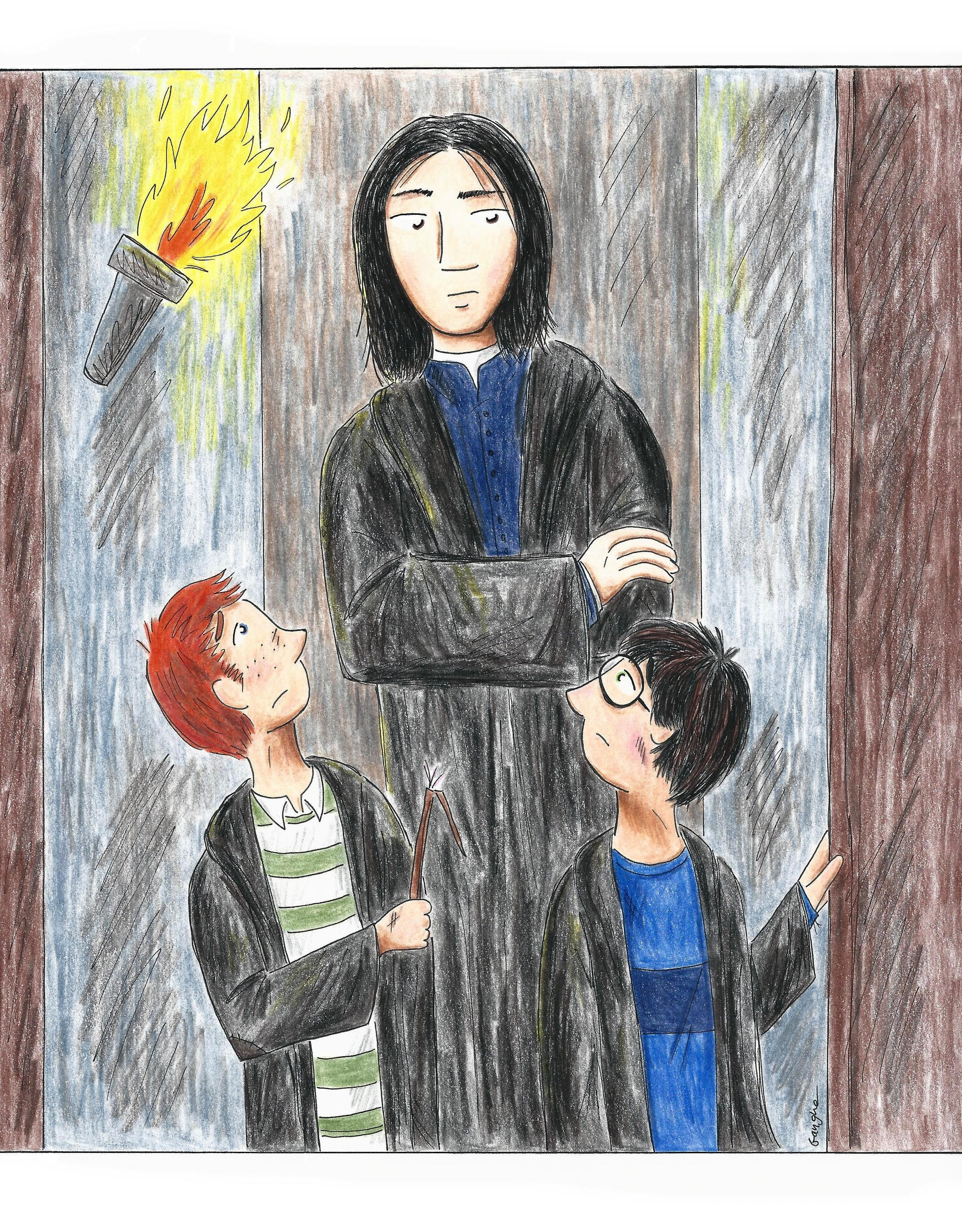 “Come, Potter,” he said, guiding the boy through the gaping throng of wet Gryffindors. “You two, as well,” he added to Ron and Hermione.
