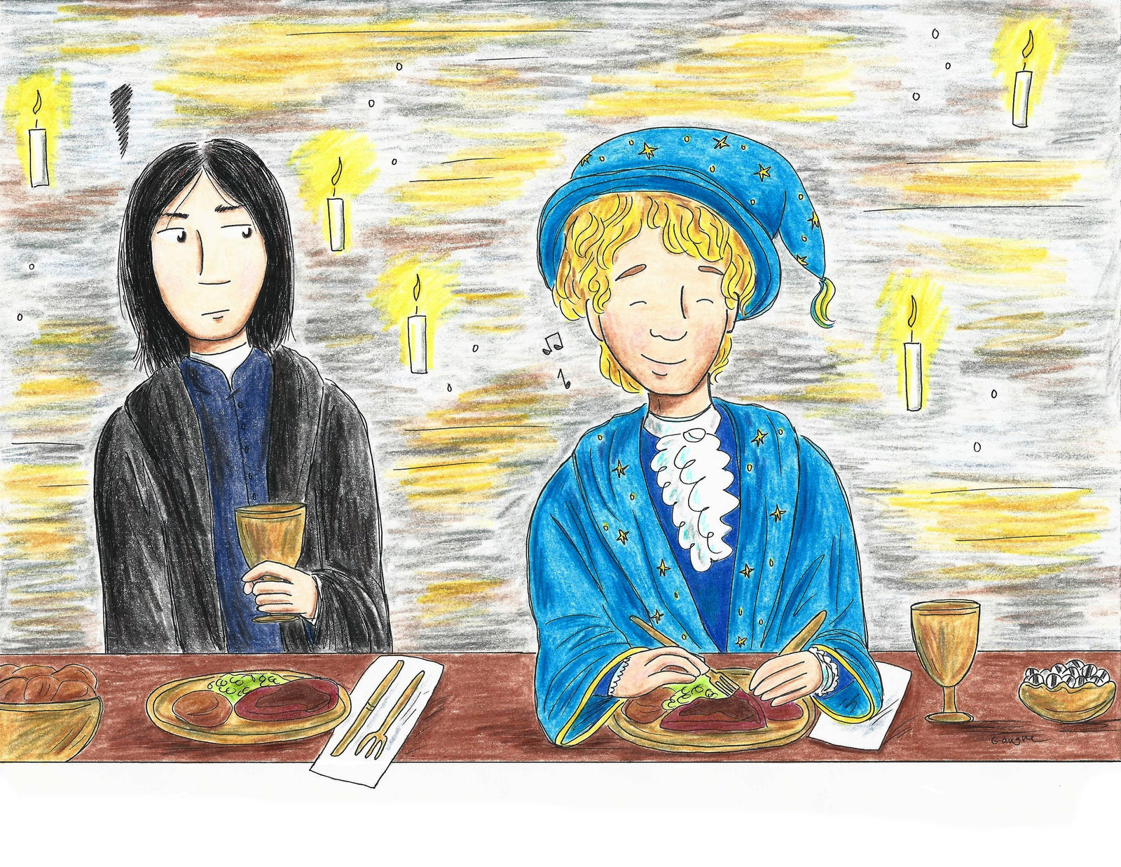 His words were met with a chorus of laughter and claps, followed by gasps as the feast magically filled all the golden dishes on the tables.