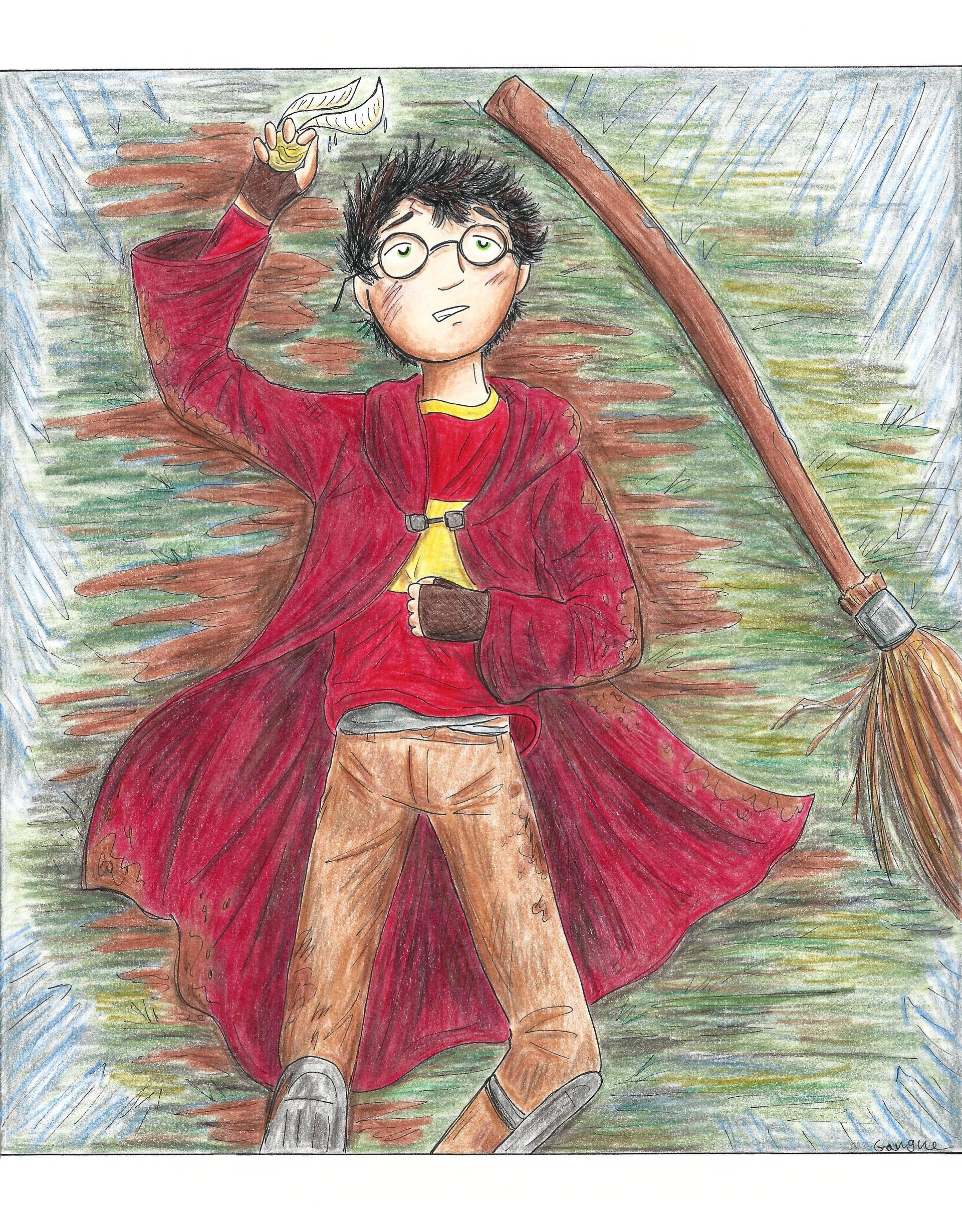 Harry hit the ground, sliding through the mud. His body came to a stop, and he lay gasping in the rain, the Snitch in his hand.