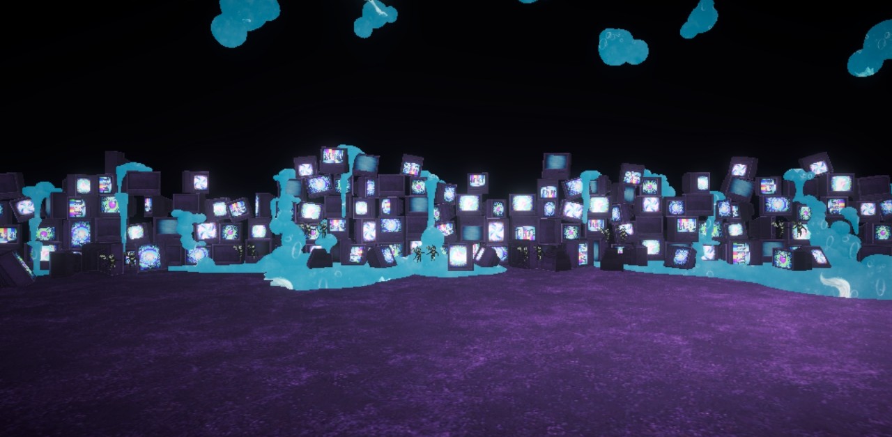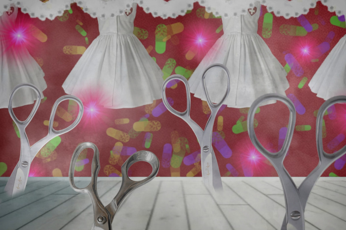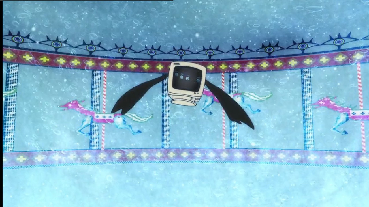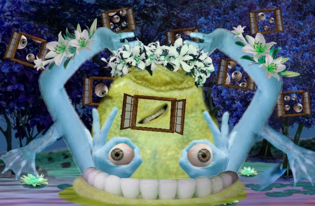 When she jerked her head up, something huge was floating up in the sky. It loomed high above the wreckage, almost too big to comprehend. There flew an upside down figure with a puffy blue gown, dancing freely in the air. Giant gears turned inside of it, ribbons and streamers trailed from its form, and its crooked smile stretched across what looked like a face but wasn’t. The sight of this hideous creature made Kaede’s blood run cold.