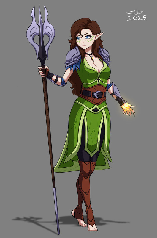 I jolted and whirled around, stumbling back. On a rocky ledge on top of the cave’s opening was a woman - short and lithe. She wore what looked to be a sleeveless and low cut green robe with a red sash, which was held up by a brown leather belt. She had basic shin guards, leather arm pieces, and shoulder plates of a shiny silver color. She wore black tight legging-like pants and brown boots as well, with metallic edges over the collars of her footwear. Small green armored pieces were on the heels of her boots, with similar ornate golden markings. Her feet were semi-exposed, revealing small pale toes.