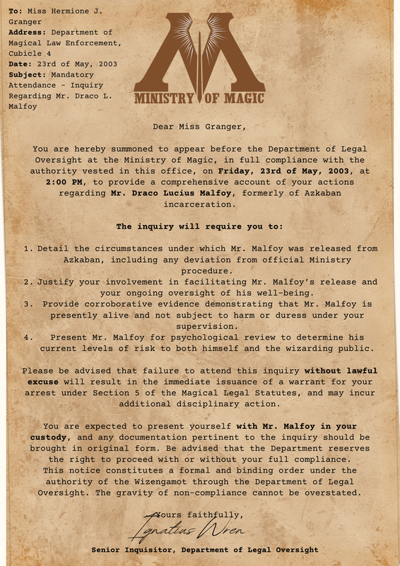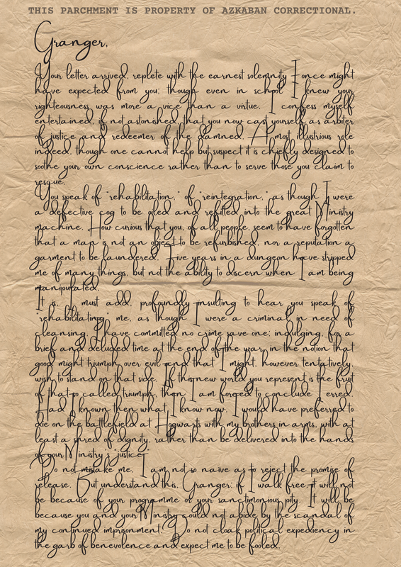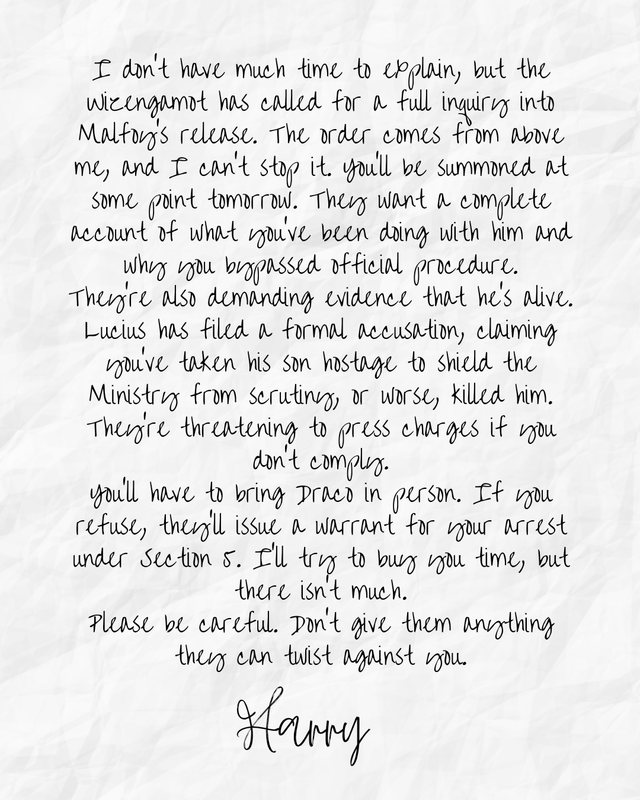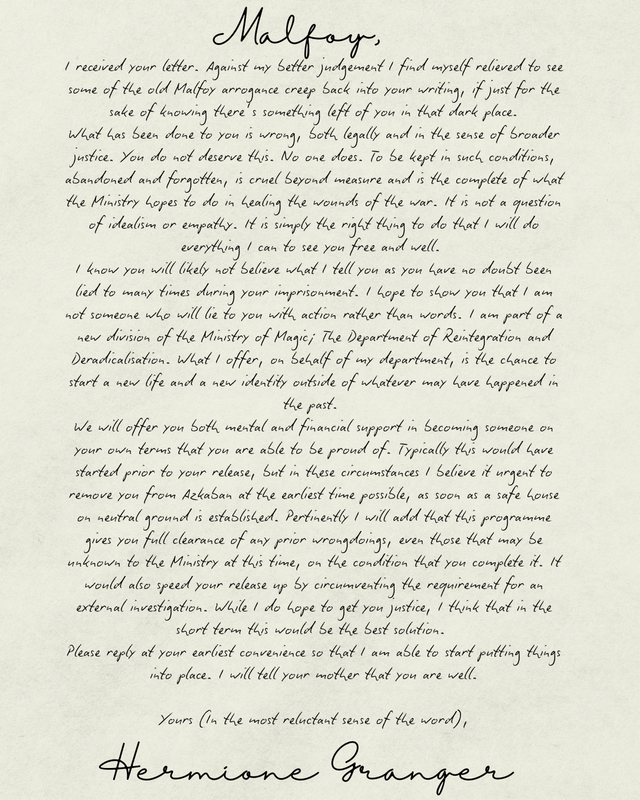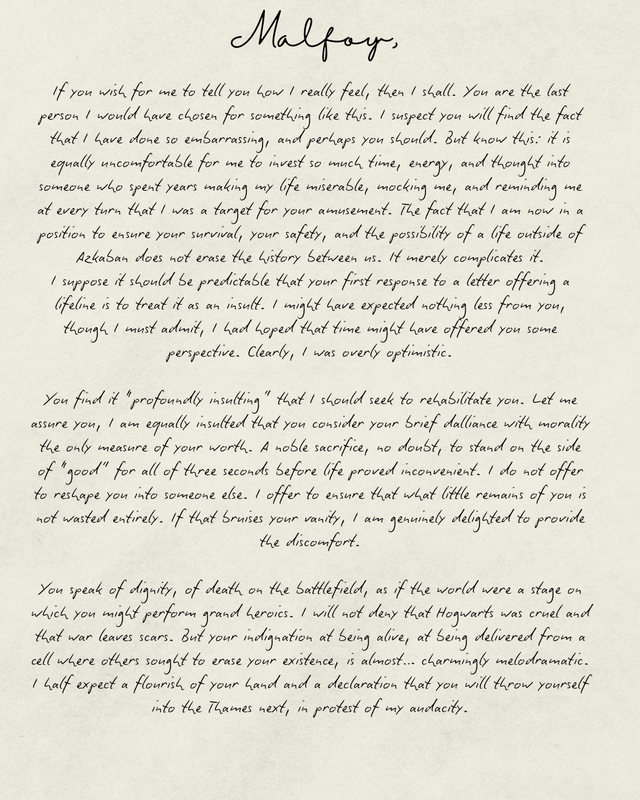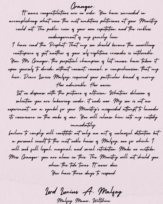 For a long moment Hermione stood there, staring down at the letters. She had spent years building systems to make sure this didn’t happen, to make sure no one disappeared into the machinery of the state. And yet here was proof that someone had. Someone she’d known since childhood, no matter how foul he had been.