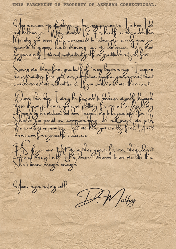 The only son of Lucius and Narcissa Malfoy who defected near the end of the war and aided Harry Potter in the final battle - Draco’s case has long been a point of contention. While guilty of aiding the Dark Lord, testimonies during the trials established that he acted under duress, forced into compliance by threats to himself and his family. Others convicted of far graver crimes have since been released or pardoned, leading many to believe that Draco’s unusually harsh sentence was intended less as justice and more as a warning to other pure-blood families about the consequences of clinging to old allegiances. The Malfoy family failed to respond for comment.”