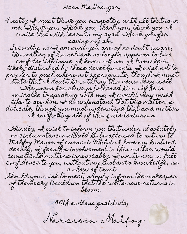 Hermione reached for them slowly. The parchment was almost crumbling in its age, the top letter on the stack coated with fine dust. The first envelope bore Narcissa Malfoy’s name in delicate ink. Hermione untied the ribbon and flipped through the stack. The first letters that had been opened were formal, polite, inquiries about visitation schedules, requests for confirmation of her son’s welfare. Then as Hermione reached later letters, ones that Harry had not even broken the seal on, the tone changed. The later letters were frantic, the handwriting uneven, as though written through tears.
