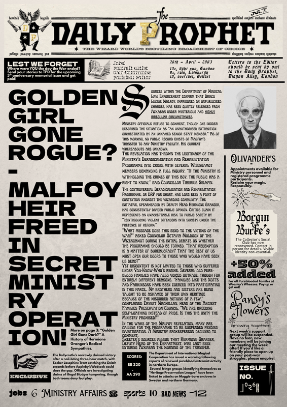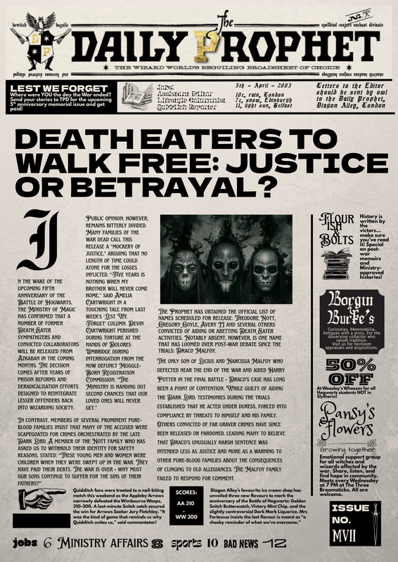 Front Page — 5th of April, 2003“DEATH EATERS WALK FREE: JUSTICE OR BETRAYAL?”