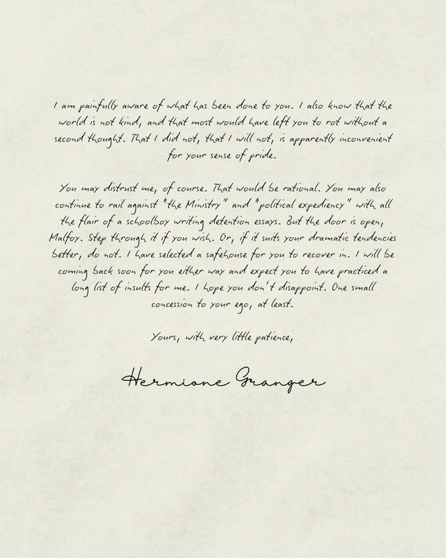 No one had told her. No one had done anything. If any family were a symbol of what needed to burn in order for the new world to rise from the ashes, it was the Malfoys. If there would be any poster boy for the redemption she was trying to show the world was possible, Draco Malfoy was the perfect fit. So where was he? She had built the entire department meant to ensure that such oversights never happened again, so that the ministry would never be complicit in fanning the flames of another war, and yet this, this single name, suddenly made all of her careful work feel hollow.