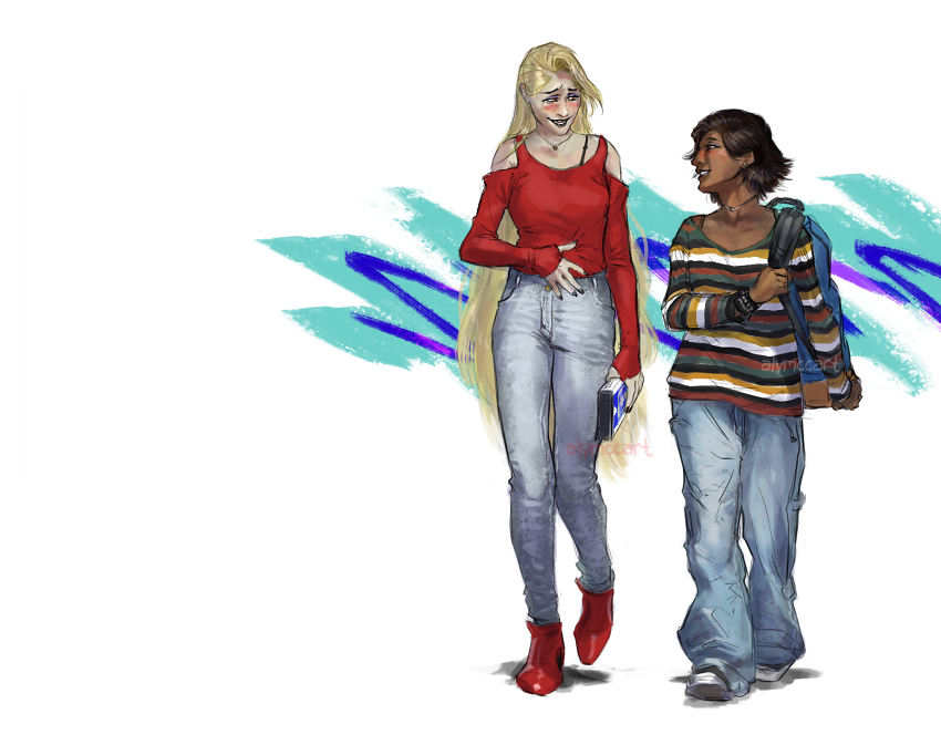 “Excuse me? Um, sorry,” a tall woman—like, absurdly tall, holy hell—said as she approached Vaggie. She appeared to be about Vaggie's own age. “I’m looking for History of Graphic Design? It’s in the Maxwell Building. Room-“ she squinted at a slip of paper in her hands and Vaggie couldn’t help but take note of her long, black polished fingernails, “-One-oh-four.”