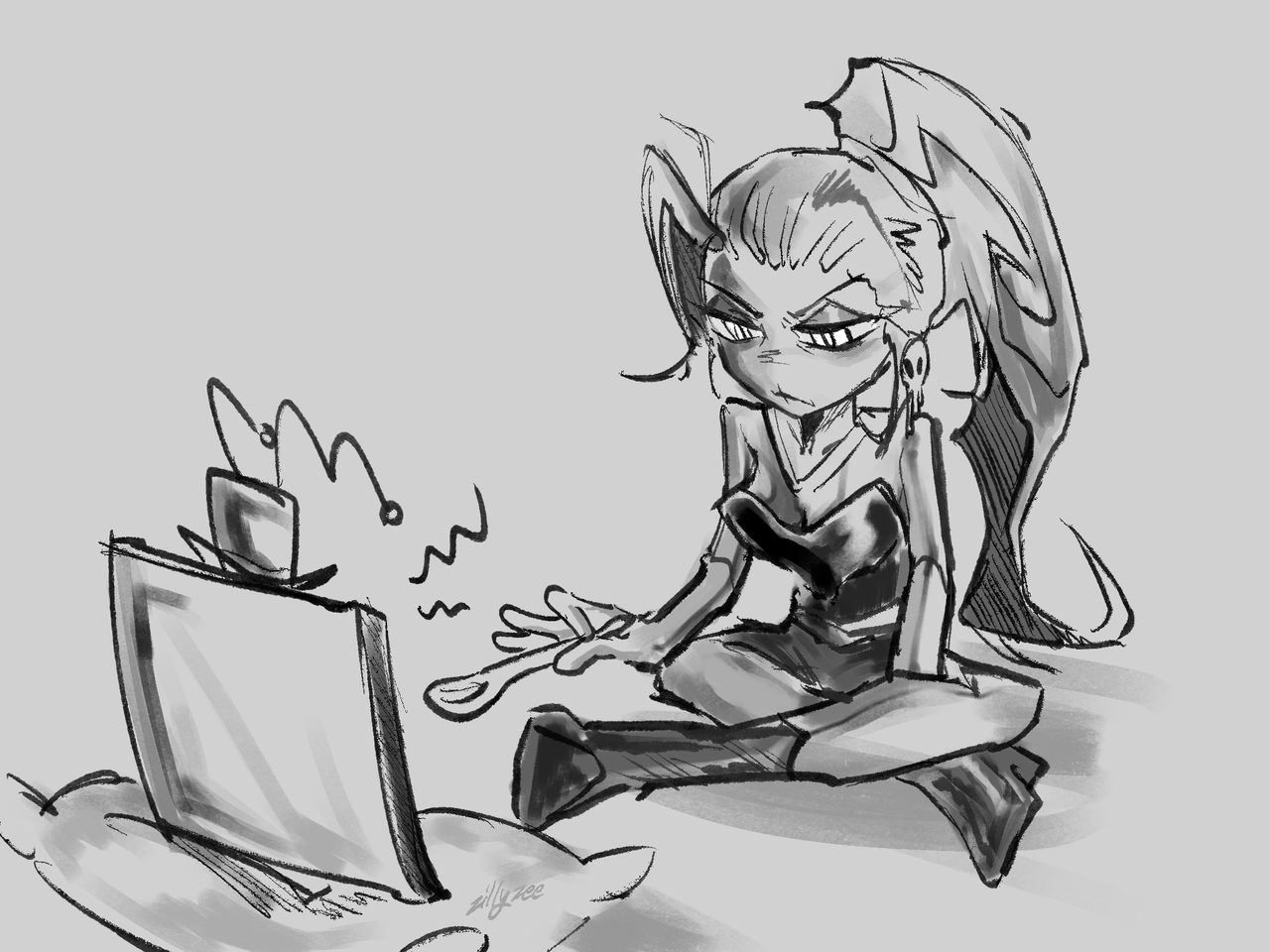 She took his unintelligible grumble as an answer, the TV demon begrudgingly wrenched his mouth open to take another bite. Velvette watched to make sure he didn’t choke on the spot and died, her eyes never leaving him.