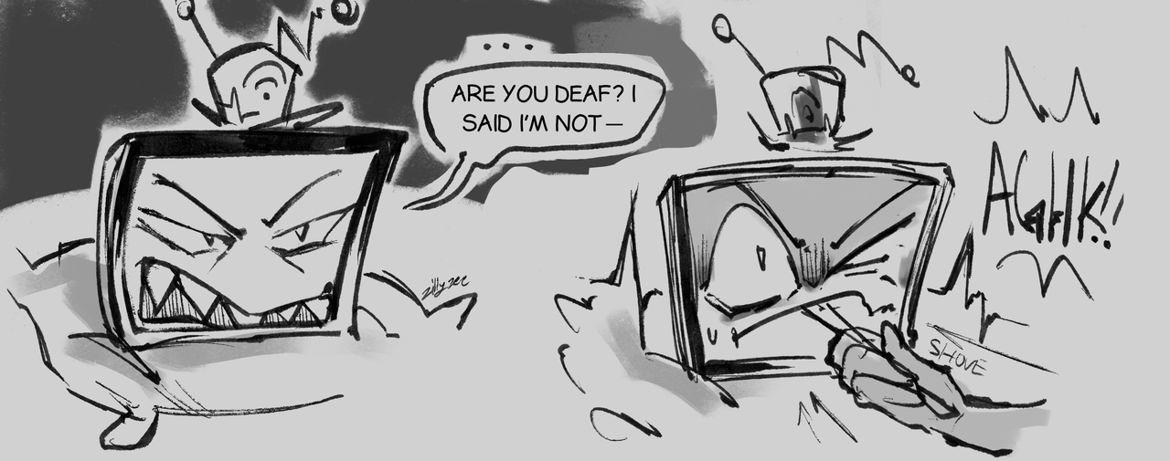 “This is MY moment! MY fucking destiny!” Vox watched himself from afar as he screamed the words like a psychiatric patient. Feeling tremors of static overloading his voice, as if it could push away their hidden jabs, insults and glares.