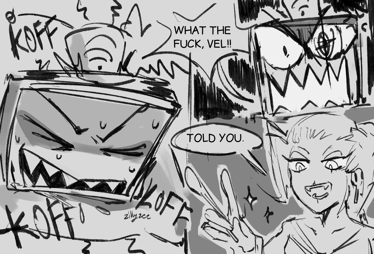 Satisfaction held her closely as she watched Vox hacked, the soup going down his throat against his will. When he was finished choking down the meal, he glared at her with utmost ferocity, “What the fuck, Vel?!”