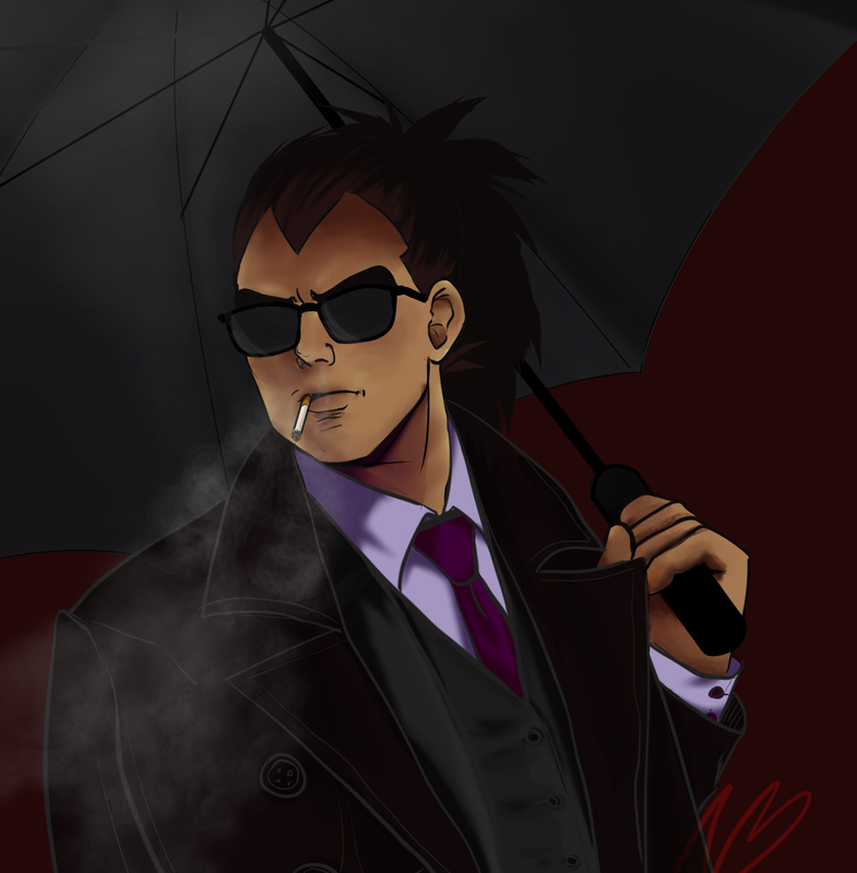 “Hey, handsome! Can you spare a girl a light?” She asks with a disarming smile as she peers under the umbrella. It’s difficult to see him well, but she sees large dark glasses covering his eyes, his eyebrows furrowed, and a cigarette hanging out of his mouth from the side; smoke bellowing ominously from his nostrils. He hesitates for a moment and straightens his posture, staring at her. His long, spikey dark hair is pulled back into a tight ponytail, and he has a very deep widow's peak between his thick eyebrows.