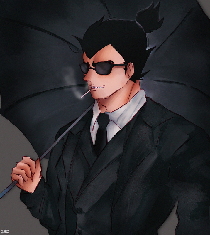 As she tries to move quickly, she notices someone with an umbrella, the smoke billowing from beneath it. She can make out a long coat and a dark gray suit underneath. Bulma smirks as she notices he’s leaning against a “no smoking” sign, and she takes a small detour from the entrance and hustles over to him.