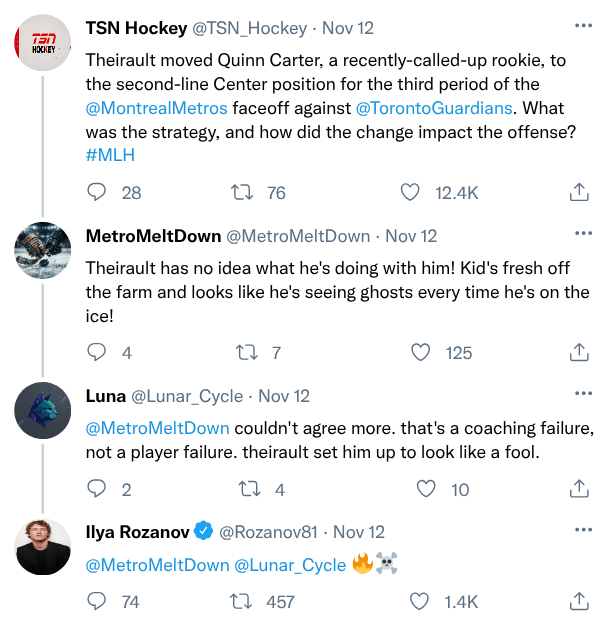 “Okay, first, know your opponent,” Rozanov says. They’re sitting in the arena on the second level, overlooking the empty rink as the zamboni smooths the ice post-practice. “Good chirps come with research. If you know things about the player, it is easier to be creative.”